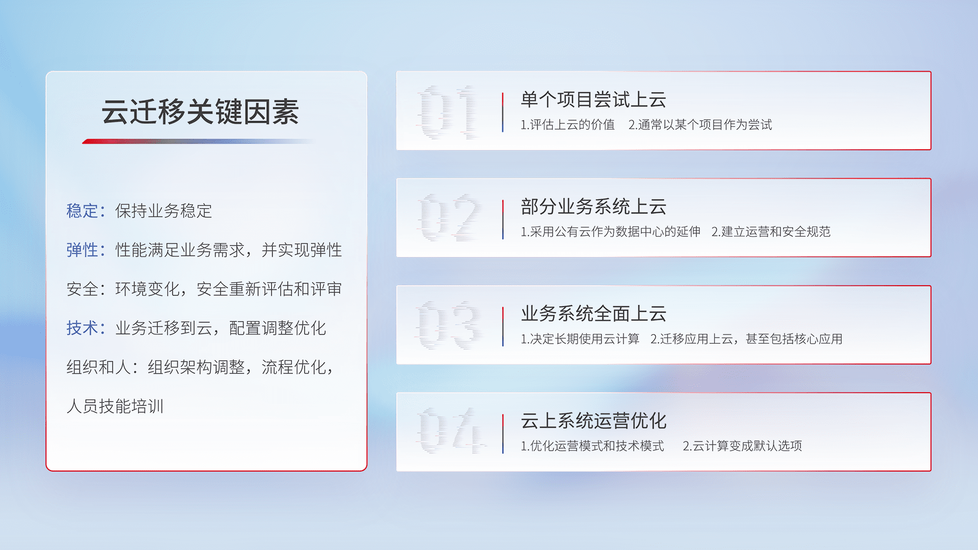 结合实际业务,,,,从规划设计、、、云平台选型、、、云原生改造、、、数据迁移、、、、集成交付,,,,迁移全过程为客户识别最佳上云路径,,,,做好风险识别管理,,,设计网络架构、、身份权限、、、安全审计合规、、、、操作审计、、、、日志审计、、、、监控告警策略、、多站点容灾设计等,,,,对云上基础设施进行整体规划,,提升IT治理水平,,以满足弹性、、、高可用、、、高性能的需求。。。。