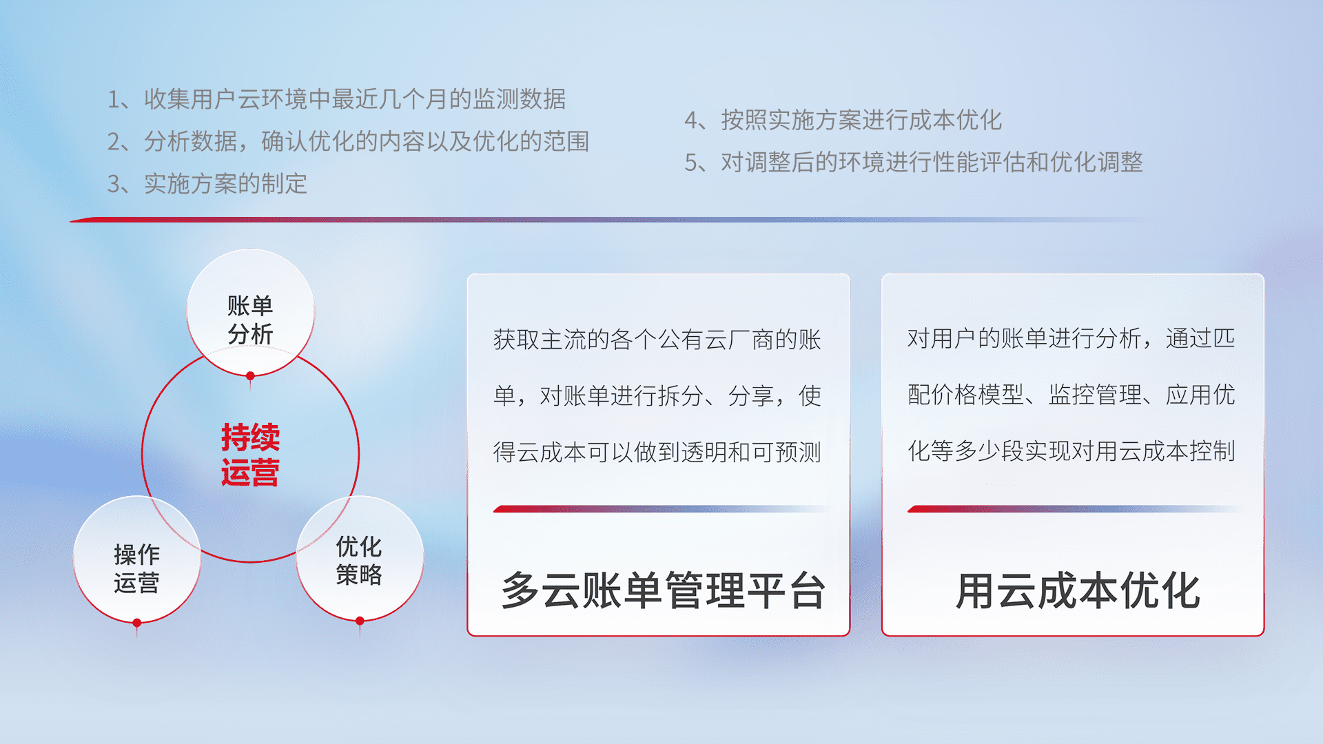 通过多云纳管,,,以统一的资源数据模型把客户的云资源进行抽象和封装,,进而实现对多云资源的统一操作,,,保障云资源管理的可靠性、、稳定性与可用性。。。。量身定制化运维内容,,,配置、、、开发运维、、、补丁管理、、、、备份、、监控、、、、认证和访问管理、、、、审计和日常巡检等,,保障在用云过程中的可靠度,,,,稳定度以及高可用率。。。。