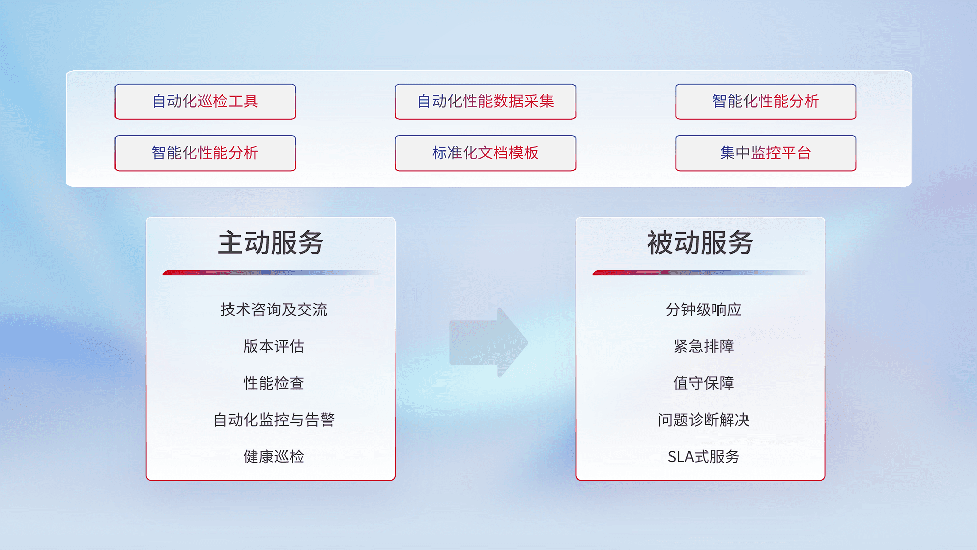 智能化工具和标准化文档,,,,保障服务质量,,,提供主动服务(包含技术咨询、、版本评估、、性能检查、、自动化监控与告警、、、健康巡检)和被动服务包含(分钟级响应、、紧急排障、、、、值守保障、、、问题诊断解决、、SLA服务)。。。